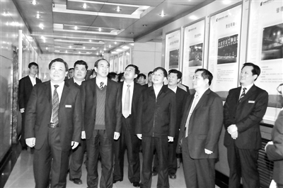 集团公司党委工作暨创先争优活动和企业文化建设推进会议在鲍店矿举行。图为矿领导陪同集团公司领导参观文化长廊