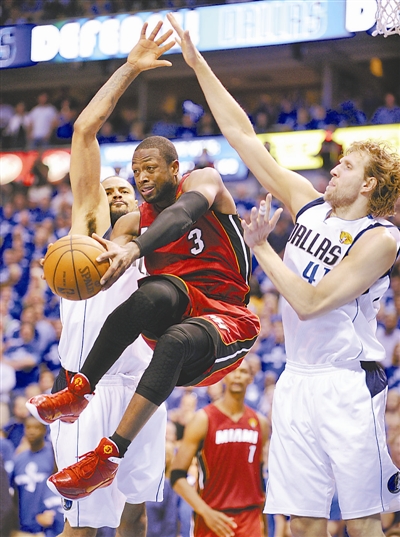 6月7日,热火队球员韦德(中)突破小牛队球员诺维斯基(右)和钱德勒的防守。当日,在NBA总决赛第四场比赛中,达拉斯小牛队主场以86比83战胜迈阿密热火队,总比分2比2战平。
