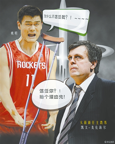 北京时间6月9日,火箭队新任主帅麦克海尔在接受媒体采访时表达了自己对姚明的看法:健康是他得到重用的首要条件。对此,麦克海尔一点都不乐观,“我们见过不少大个子备受脚伤困扰,我觉得没人能保证这些大个子伤愈之后就能彻底摆脱伤病,姚明又是一个巨人。所以,我觉得这种事更让他头疼,我们只能等待,静观其变。”