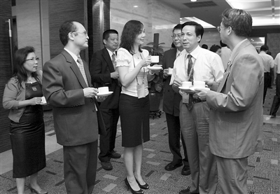 发端民间、根植民众,立足海西、襟怀两岸。在6月12日召开的第二届海峡职工论坛上,来自海峡两岸工会和劳工界的新老朋友欢聚一堂,整个会场洋溢着浓浓的同胞亲情。图为论坛茶歇间隙福建省总工会副主席高清平(右二)用闽南话与台湾同胞畅谈友谊与合作。
