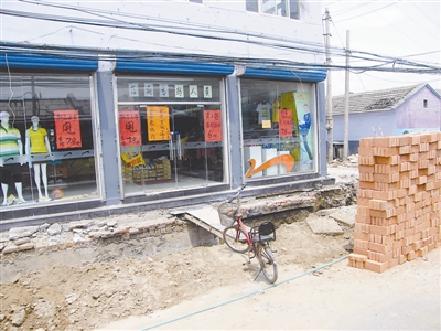 正值端午节放假期间,在南小街一村到南小街三村的这条路上,本该热闹的村子,除了少数的村民外,几乎看不到其他什么人。沿街的商铺大多被清空了,少有的几家店铺也在深挖的下水道外侧苟延残喘。墙上大多用黄纸书写着“应季新货,撤店狂甩”的字样,但是并没有人跨过深挖的壕沟去购买这些物美价廉的产品,崭新的黄纸在阳光下显得分外刺眼,与城里小长假的热闹氛围不同,这条大街显得落寞而萧条。