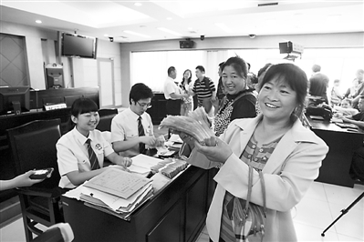 6月8日, 经北京市平谷区人民法院东高村法庭适用小额速裁程序审理,40多位北京林峰毛织厂工人当场领到了被拖欠的22万余元工资款。这是北京市小额速裁群体纠纷第一案,也是该市首例经人民法庭审理的小额速裁案件。图为一名工人领到工资后向同事们展示。