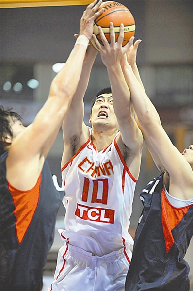 6月12日,中国队球员张兆旭(中)在比赛拼抢。当日,在江苏省南京市举行的2011年东亚男篮锦标赛中,中国队以61比54战胜韩国队。新华社记者 杨磊 摄