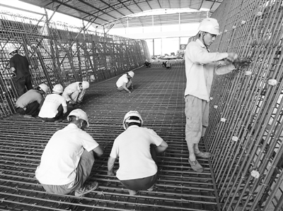 图为亚洲第一大高铁箱梁场——杭(州)长(沙)客运专线金华金东制梁场的施工人员在进行钢筋绑扎。