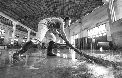 图为6月14日,湖北通城宝塔砂布厂的工人在清理厂房里的淤泥。 新华社记者 程敏 摄