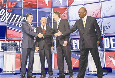 6月13日,前马萨诸塞州州长米特·罗姆尼(左一)等竞选人在美国新罕布什尔州曼彻斯特圣安塞尔姆学院参加共和党党内总统预选辩论。当天,美国共和党7名总统竞选人齐聚新罕布什尔州最大城市曼彻斯特,参加当晚举行的共和党首场总统预选辩论,拉开共和党总统预选帷幕。 新华社记者 王丰丰 摄