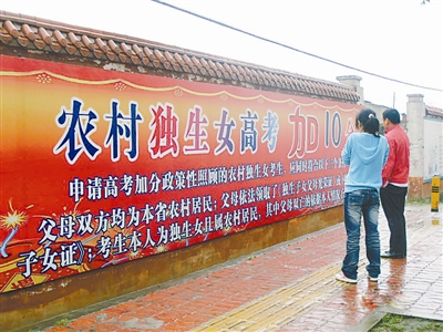 今年湖北继续执行2009年出台的农村独生女报考省属院校的优录政策。为了扩大影响力,各地计生部门还在醒目之处,推出大幅广告。这一政策引来众说纷纭——