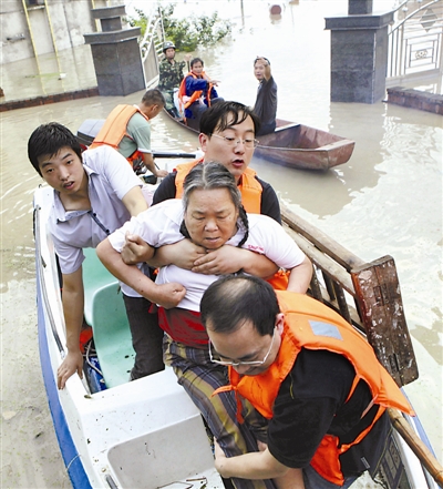 6月16日,救援队员在浙江省诸暨市浦阳江湄池段转移群众。
