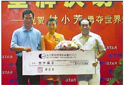 会上,北京星伟公司奖励付小芳3万美元。图为体育总局小球中心主任张小宁(左)和星伟集团公司董事长甘连舫为付小芳颁奖献花。 何东宪 摄