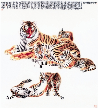 回眸虎崽乐相融 (国画)杜 军