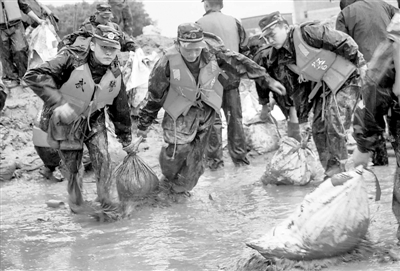 6月19日,暴雨再度袭击赣北北部及赣东北地区,局部乡镇出现了大暴雨。受暴雨天气影响,江西乐平市乐安河支流安殷河水位出现一定程度上升,在乐平市礼林镇牌楼村圩堤决口处,为防止不断上升的河水涌入农田、道路、村庄,武警景德镇支队一百多名官兵在暴雨中装填土石,搬运沙袋,封堵决口,争抓每一分每一秒,及时排除决口险情,确保牌楼圩旁的万余亩农田安全。徐铮 摄