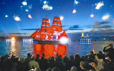 俄罗斯的“红帆节”是一年一度庆祝中学毕业的节日。每年夏至前最后一个周末的夜晚,圣彼得堡都会在涅瓦河畔举办“红帆节”,它是为了让所有中学毕业生告别少年,在黎明来临之际迎接人生的新阶段。图为18日夜,参加“红帆节”的人们在观看烟花表演。阿健 供图