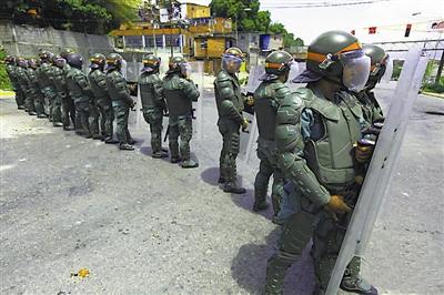6月17日,委内瑞拉安全部队发动了夺取12日发生暴动的埃尔罗德奥监狱的大规模行动,估计大约控制了4700名囚犯。不过,仍有约1300名囚犯退在监狱的一个角落负隅顽抗,拒绝投降。图为安全部队严阵以待。 谢涛 供图