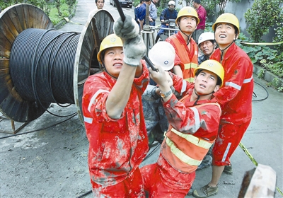 6月19日,浙江诸暨市供电局党员抢险突击队在该市店口镇抢修电力线路。受钱塘江支流浦阳江三江口解放湖决堤影响,朱公湖电排5台变压器淹没,造成排涝困难。该市供电局迅速组织由50余名党员组成的抢险突击队,冒雨抢修电力线路,以尽快恢复供电。 郭 斌 摄