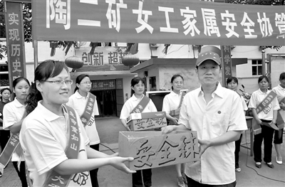 6月12日,冀中能源邯矿集团陶二矿女工委组织机关女工和部分职工家属,组成“安全协管小分队”,深入生产区队,表演了快板、独唱、三句半等节目,并为采掘职工送去了满载情谊的“安全袜”,掀起了“安全月”活动的高潮。段风越 张志斌 摄