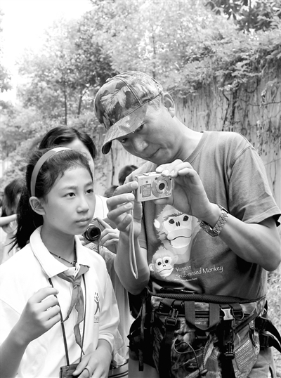环保志愿者奚志农在指导同学们如何利用影像记录和保护自然之美。