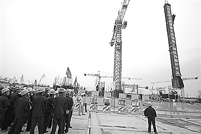 6月13日,在合肥市滨湖新区,外形酷似“中国馆”的合肥要素大市场项目地上钢结构正式开吊。由于该建筑将采用光伏太阳能发电、屋面收集雨水浇灌绿化等诸多节能环保措施,工程建成后将成为安徽首座“绿色建筑”。