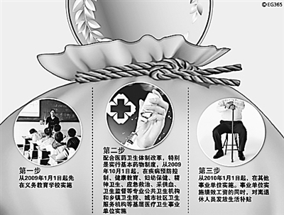 日前,国务院总理主持召开国务院常务会议,决定在公共卫生与基层医疗卫生事业单位和其他事业单位实施绩效工资,将分三步实施。