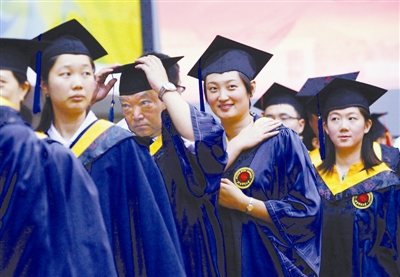 6月22日,北京,许海峰(左二)、杨昊(右二)和前乒乓国手牛剑锋(右一)排队领毕业证。当日上午,北京体育大学毕业典礼在该校体育馆举行,作为冠军班的成员,结束了三年学业的网球冠军孙甜甜、前女排国手杨昊、著名射击运动员许海峰等拿到了属于自己的硕士学位证书。林晖 摄
