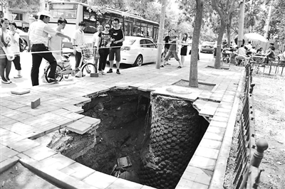 6月24日,北京增光路东段人行道早晨发生塌陷,所幸未造成人员伤亡,目前工人正在抓紧抢修。