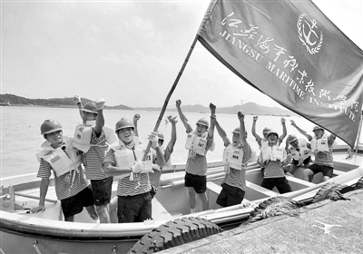 6月26日,2011中国海员技能大比武在浙江舟山群岛新区开赛。图为院校队海员在进行海上操艇比赛前为自己加油。全国航运企业组和航海院校组将在航线设计、六分仪测距等项目中展开角逐。本次活动由中国海事局、中国海员建设工会主办,是我国首次举办的全国性海员技能大比武活动。
