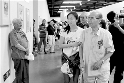 6月26日上午,“首届民生漫画作品展”在北京举行首展开幕仪式。开幕式特别安排了红毯环节,来自全国的90位中国漫画家在红毯仪式中亮相。图为方成、江有生、李滨声等国宝级漫画大师、已故著名漫画家丁聪的夫人沈骏亲自到场,和众多漫画家以及漫画爱好者们共同见证这一漫画盛事。本报记者 许之丰 摄