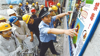 为迎接6月26日国际禁毒日,辽宁省锦州市义县百名青年禁毒志愿者走进工地、出租屋,走近农民工,进行禁毒宣传,教育农民工兄弟珍爱健康、珍惜生命、远离毒品、拒绝毒品。李铁成 摄