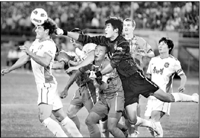 6月26日晚,中超足球联赛第13轮,北京国安主场与天津泰达1比1战成平局。图为下半场国安队围攻泰达,在客队门前制造一场混战。本报记者 许之丰 摄