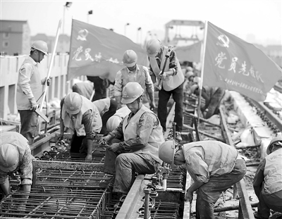 6月27日,中铁一局“党员先锋队”的党员们在高温中进行铺轨施工,保证施工顺利进行。为了保证杭州地铁1号线施工进度,中铁一局杭州地铁1号线轨道工程正线二标项目部在施工工地成立“党员先锋队”,由有经验、能吃苦的党员先锋带头奋战工地,用实际行动迎接党的生日。新华社记者 徐昱 摄