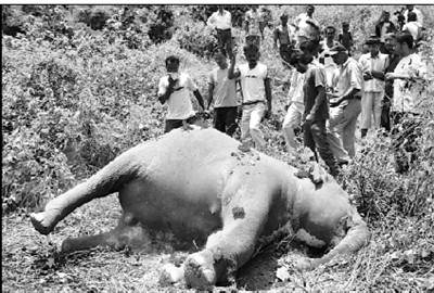 6月22日,在印度东北部阿萨姆邦首府高哈蒂市郊区,当地居民向一头被火车撞死的大象献花。