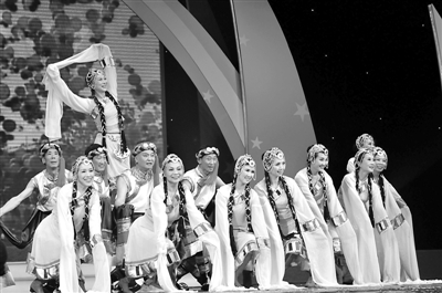 6月29日,北京市东城区总工会举办了庆祝中国共产党成立90周年暨第二届“五月的鲜花”群众歌咏活动汇报演出,来自该区朝阳门街道、第一人民医院、区委宣传部等单位的代表队为观众献上了精彩的节目。图为东直门街道代表队表演舞蹈《再唱山歌给党听》。