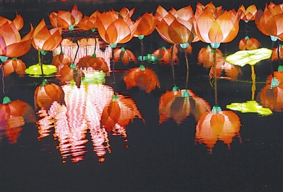 图为“中华和谐灯”倒映于湖中,与小荷灯相映成趣。本报记者 李瑾摄