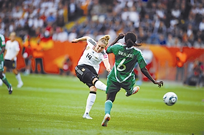 6月30日,德国队球员金·库利希(左)在比赛中射门。当日,在法兰克福进行的2011年德国女足世界杯A组比赛中,德国队以1比0击败尼日利亚队。新华社记者 李俊东 摄