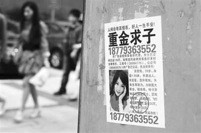 近日,在江苏无锡市城区多条道路两侧又见“重金求子”的骗人广告,该广告称某女子家业丰厚,丈夫因意外致残不能生育,寻外地健康男士助其怀孕生子,以承家业。