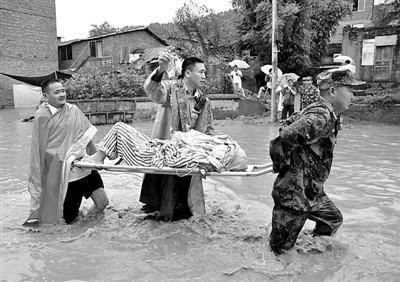 7月6日,四川巴中市遭遇特大暴雨袭击,造成百余民众被洪水围困。市消防支队官兵全体出动,利用冲锋舟、皮筏艇赶到被淹的区域,解救转移被困民众119人。金静 摄