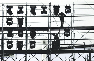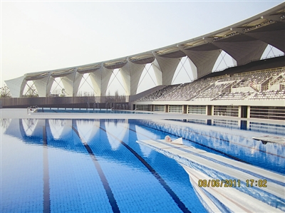 日前,工人在上海水上运动中心检查设施,备战2011游泳世锦赛。