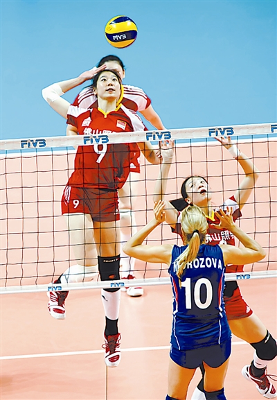 7月7日,中国队球员杨珺菁在比赛中扣球。当日,在俄罗斯叶卡捷琳堡举行的第九届叶利钦杯国际女排邀请赛小组赛第二场比赛中,中国队以3比1击败俄罗斯队。
