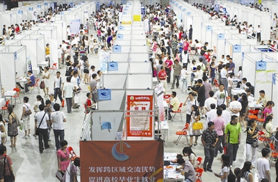 7月9日,在天津体育中心举行的京津冀高校毕业生招聘会现场,求职者摩肩接踵。