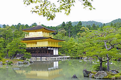 京都金阁寺原名鹿苑寺,建于1379年,原为足利义满将军的山庄,在其死后改为禅寺。金阁寺一名源于足利义满修禅的舍利殿以金箔装饰,而后被称为金阁寺。