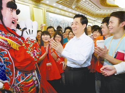 新华社北京7月12日电 (记者李亚杰 陈键兴)中共中央总书记胡锦涛12日下午在北京人民大会堂参加两岸万名青年大交流主题联欢活动,亲切看望两岸青年朋友,与大家共同领略中华传统文化魅力,共同展望两岸关系和平发展前景。