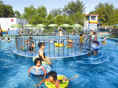随着伏天的到来,京城内可以纳凉消暑场所的人流明显增多。记者近日在东城区青年湖公园水上世界看到,刚刚放暑假的孩子们,在家长的陪伴下忘情嬉戏(如图)。