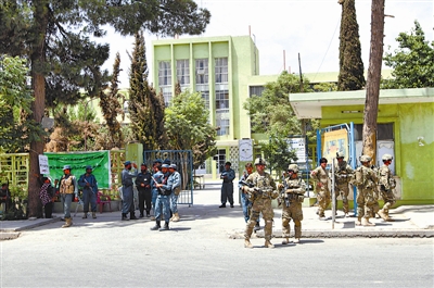 7月12日,在阿富汗南部坎大哈省,阿富汗警察和北约士兵把守着一家医院。
