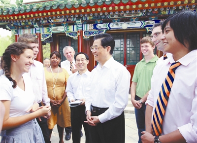7月15日,国家主席胡锦涛在北京中南海会见美国佩顿中学访华师生。这是胡锦涛主席在瀛台湛虚楼前同佩顿中学学生们谈笑风生,了解他们在中国的见闻和感受。 新华社发