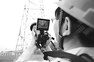 7月12日下午,安徽宿州供电线路员工用红外线测温仪测量京沪高铁宿州段(桃沟)牵引站至两个电源点——220千伏墉桥开关站和220千伏双庆变电站供电线路接点温度。