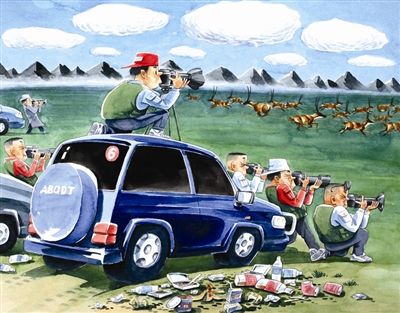 关注一类物种,关注形式也不能不引起关注。正如我们在作品里看到的,为了近距离关注藏羚羊,摄影师来了,机动车来了,各种“长枪短炮”来了,饮料瓶、易拉罐儿、各种餐盒也来了。而看这意思,后面那几位“不速之客”显然是不想走了。如此一“来”,再加上来而不往,藏羚羊的“家”就离“宜居”远了。