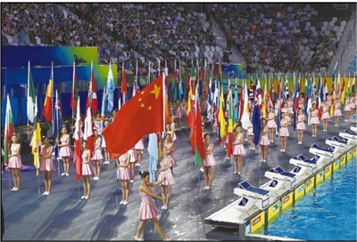 7月16日,第14届国际泳联世界锦标赛开幕式在上海东方体育中心体育馆举行。图为在开幕式上,引导员手持中国国旗入场。