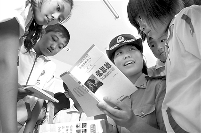 7月17日,辽宁省公安边防总队营口鲅鱼圈边防检查站的一名女警官在和农民工子女一起阅读暑假课外读物。暑假前夕,该边防检查站官兵来到鲅鱼圈海星小学,向60名农民工子女送去科技、法制、革命故事等暑假课外读物300余册,让孩子们度过一个快乐而有意义的暑假。蔡冰 摄
