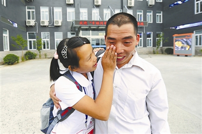 7月12日,来自广西百色、桂林和湖南张家界等地的51名留守儿童来到北京顺义的一家企业,与在北京打工的父母团聚。父亲见到许久未谋面的女儿喜极而泣,女儿很懂事地帮爸爸把眼泪擦干。杨天啸 摄