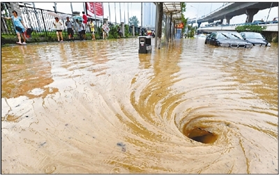 7月18日,南京市龙蹯路上一排水口处形成一个巨大的漩涡。当日,南京遭遇暴雨袭击,城区的许多主干道变成一片汪洋,交通出现严重堵塞,给市民出行带来极大不便。近年来,随着极端天气多发频发,部分城市频繁遭遇强暴雨袭击,引发严重城市内涝,可说是“逢雨必涝,遇涝则瘫”。据住房和城乡建设部2010年对351个城市进行的专项调研结果显示,2008年—2010年间,全国62%的城市发生过城市内涝,内涝灾害超过3次以上的城市有137个。