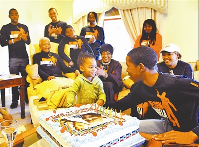7月18日,南非前总统曼德拉在家中与家人一起庆祝93岁的生日。当天上午,1240万名南非儿童共唱特别改编的生日快乐歌,表达对曼德拉的诚挚祝福。南非现任总统祖玛也向前总统曼德拉赠送了生日礼物。吉平 供图